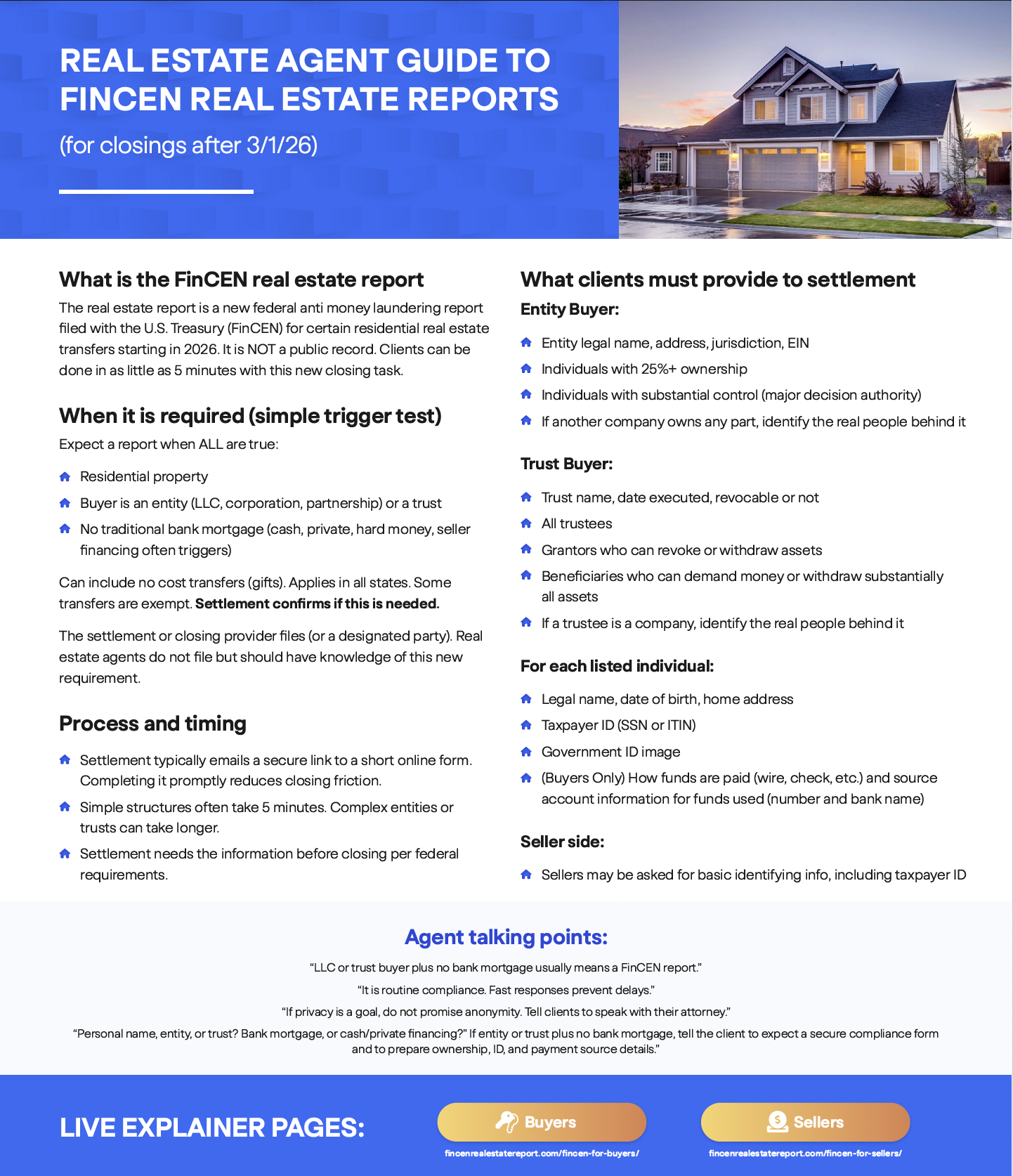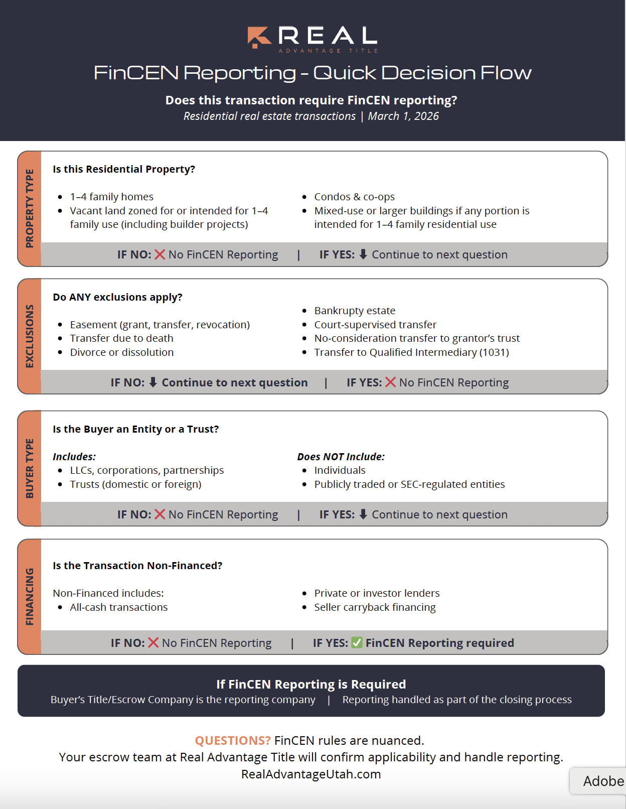 FinCEN reporting begins March 1, 2026. Certain non-financed residential real estate transactions must now be reported to the U.S. Treasury. Real Advantage is fully equipped to manage this process for you—smoothly, securely, and without disrupting your closing.